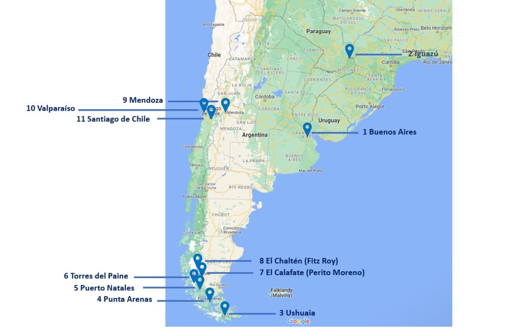 On the map you can see the list of the places my husband Jan and I visited during our Argentina-Chile trip in March-April 2023 in chronological order.